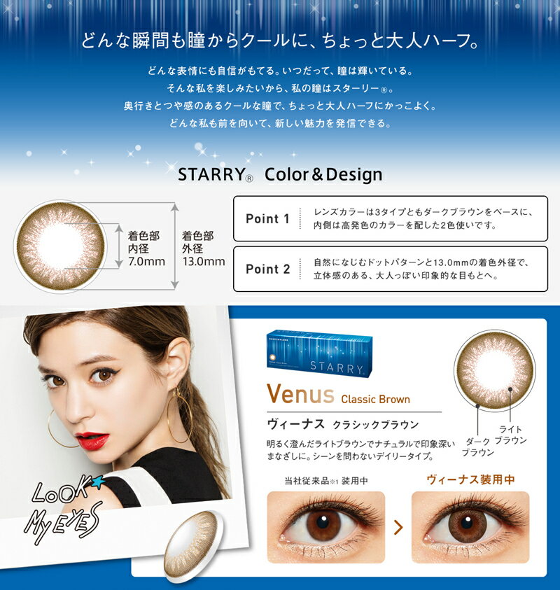 博士倫最新的日系Starry系列Color Con,3款顏色(Venus Classic Brown, Earth Casual Olive, Jupiter Cool Gray),全新的日系二重配色,在不同的場合,都能配合您的妝容展現出您獨特的個性。